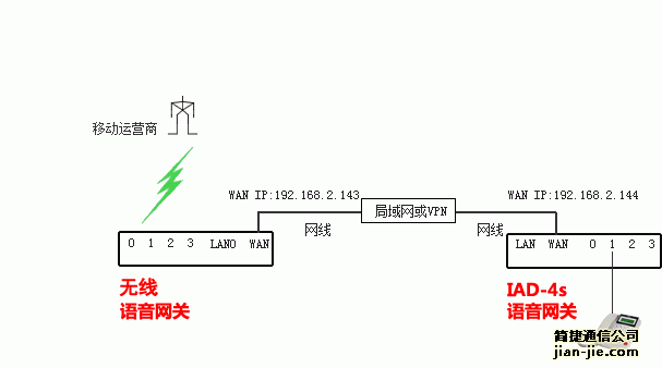 应用一:与FXS语音网关配合,可以实现分机远程放号,电话线延伸等点对点通信应用。