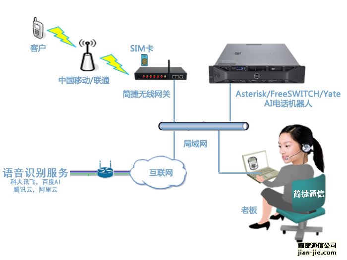 如下图所示,AI电话机器人系统包括了AI机器人软件、简捷无线语音网关、科大讯飞的语音识别服务等三个部分。