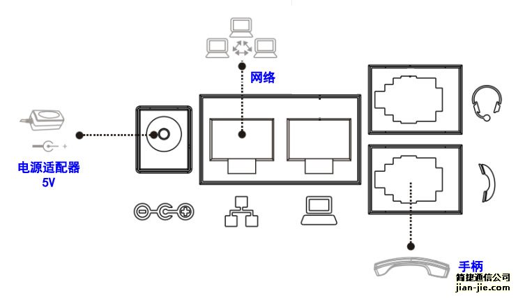 安装简单,无需设置。如下图,在单位里对交换机进行接线,共需要接入4条线 (电源线,网线,电话线):
