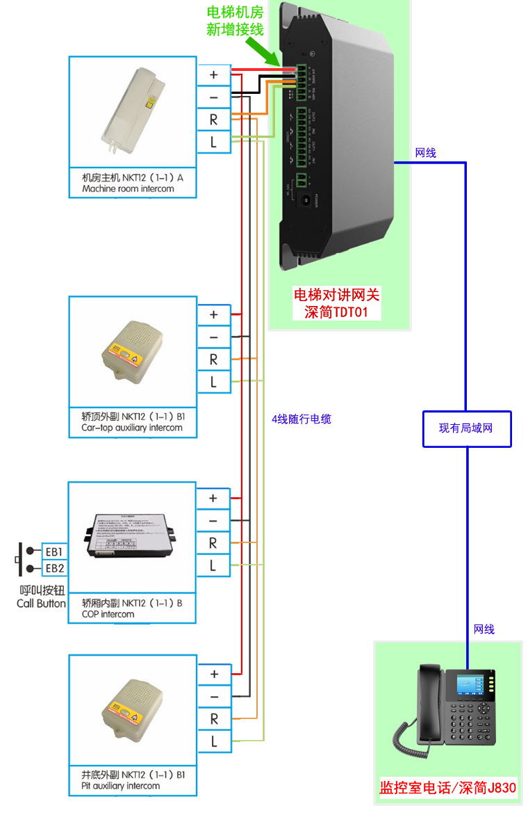 无论是换新还是利旧,电梯四方对讲的接线都是已经布好的,只需要把线缆对应接好就行,比安装视频监控还简单。如下图: