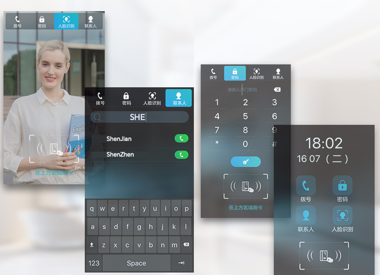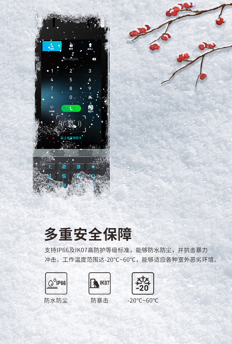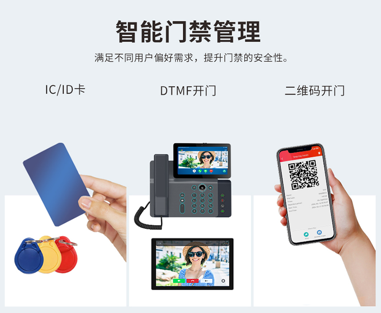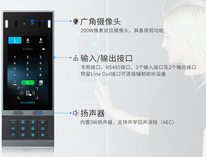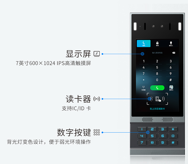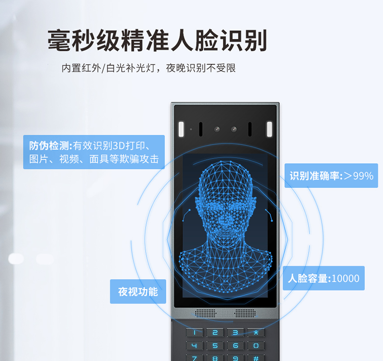 T67V人脸识别视频门禁对讲SIP,采用7寸IPS彩色触摸屏,支持双向音视频通话,配备多种开门方式,适用于社区、公寓、办公楼等场景。它采用标准SIP协议,支持和 IP 电话机、室内分机、网络摄像头、语音网关、IPPBX电话交换机或通过手机APP进行音视频通信,从而加快对业主、访客、送货人员和服务人员的响应速度,提供良好的用户体验同时还能节省运营成本。T67V搭载高精度面部识别技术,可以对图像、视频、面具等进行活体检测,极大限度保障社区安全。