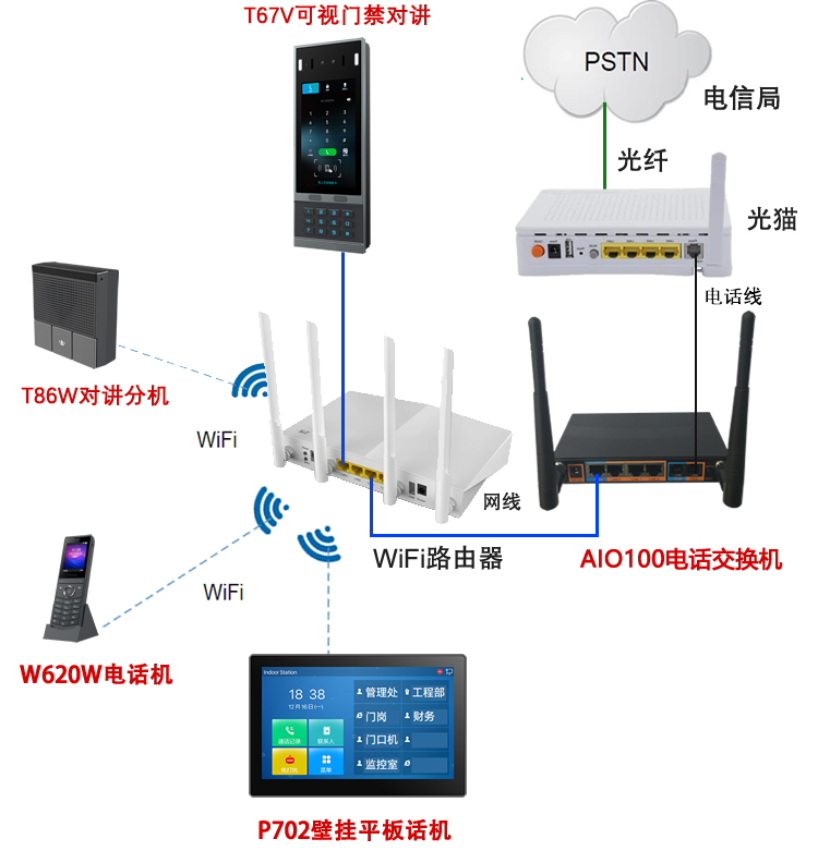 这里选择了AIO100这款IP-PBX电话交换机作为别墅电话系统的核心软交换设备。然后选择W620W无线无绳IP电话机作为电话分机,T86W-86型IP对讲分机作为紧急呼叫使用(电梯、卫生间、老人房间、儿童房间等场景使用),房间内放置P702壁挂式室内机(平板话机),门口采用T67V可视门禁对讲,搭配一套比较完整的别墅电话系统。