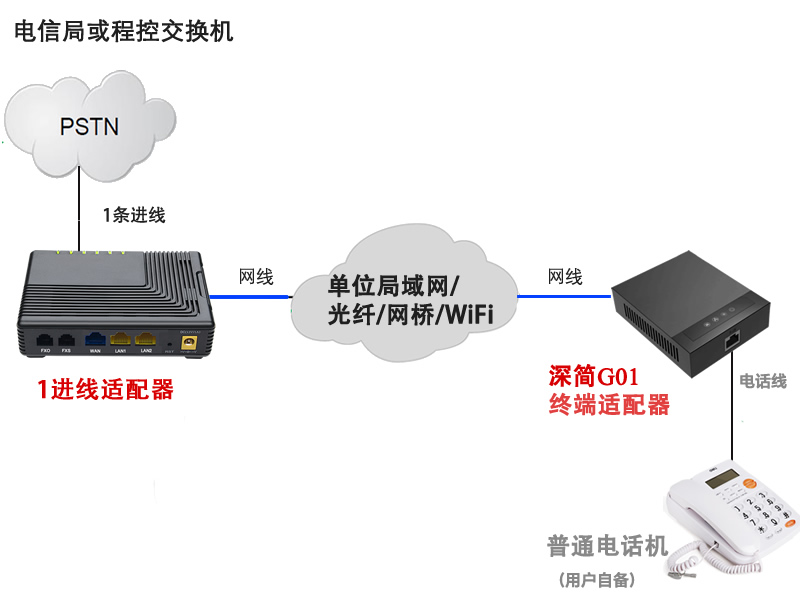 采用两个产品,分别是IP电话交换机(进线适配器)和G01模拟电话适配器。