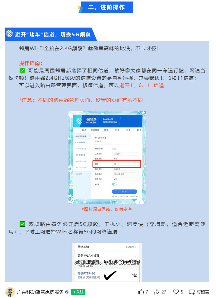 我们来看一些权威媒体的截图,比如这个来自“广东移动智慧家庭服务”的提醒:连接了干扰大的2.4GHz频段,会出现卡顿。解决办法:优先连接5g频段。